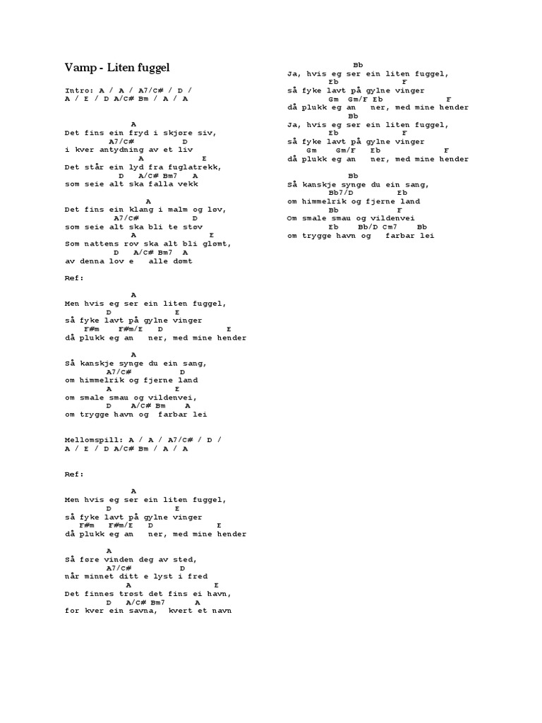 Free printable and easy chords for song by vamp liten fuggel. Når minnet ditt e lyst i fred.